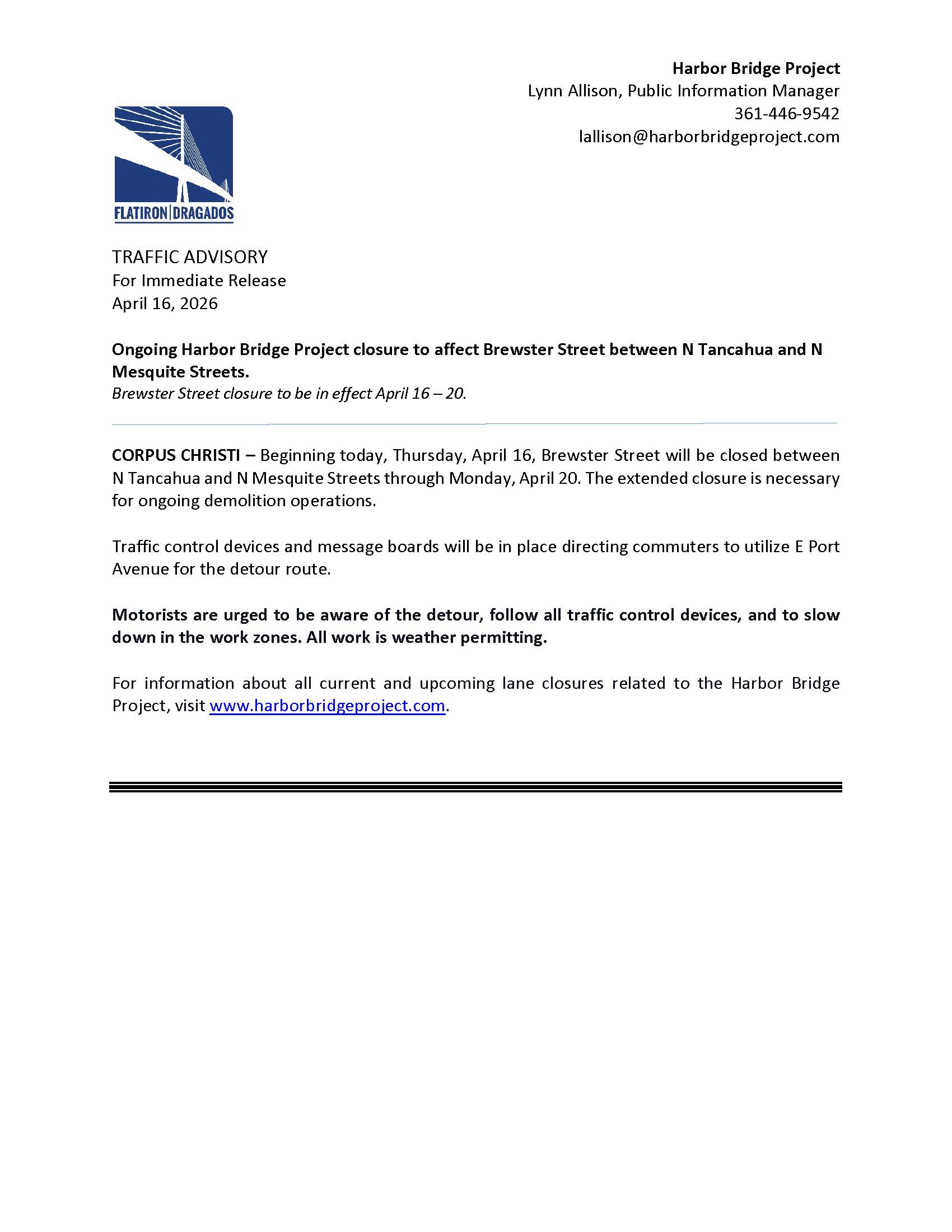 Ongoing Harbor Bridge Project closure to affect Brewster Street between N Tancahua and N Mesquite Streets. Brewster Street closure to be in effect April 16 – 20.